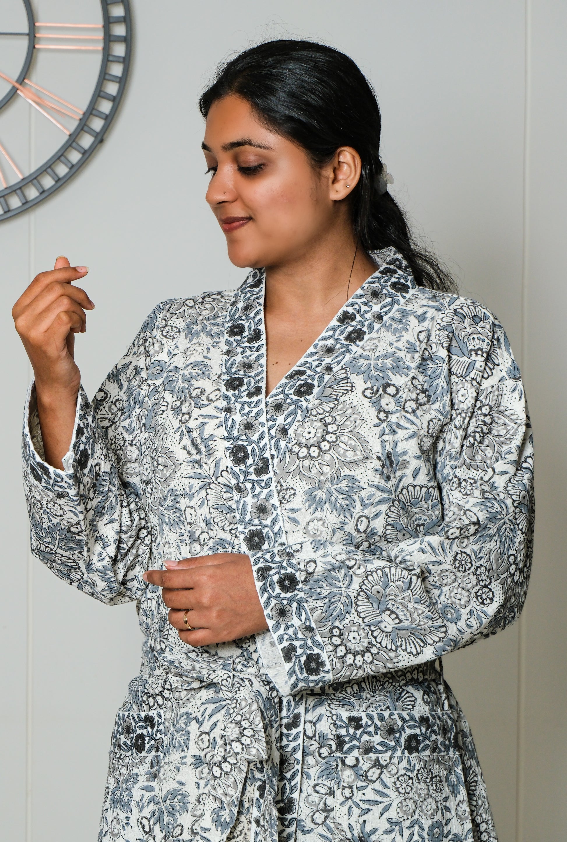 Wrap yourself in the timeless elegance of handcrafted tradition with our Jaipuri Block Print Cotton Bathrobe. Featuring intricate hand block prints of Twilight Garden, this robe brings a serene, nature-inspired aesthetic to your loungewear.